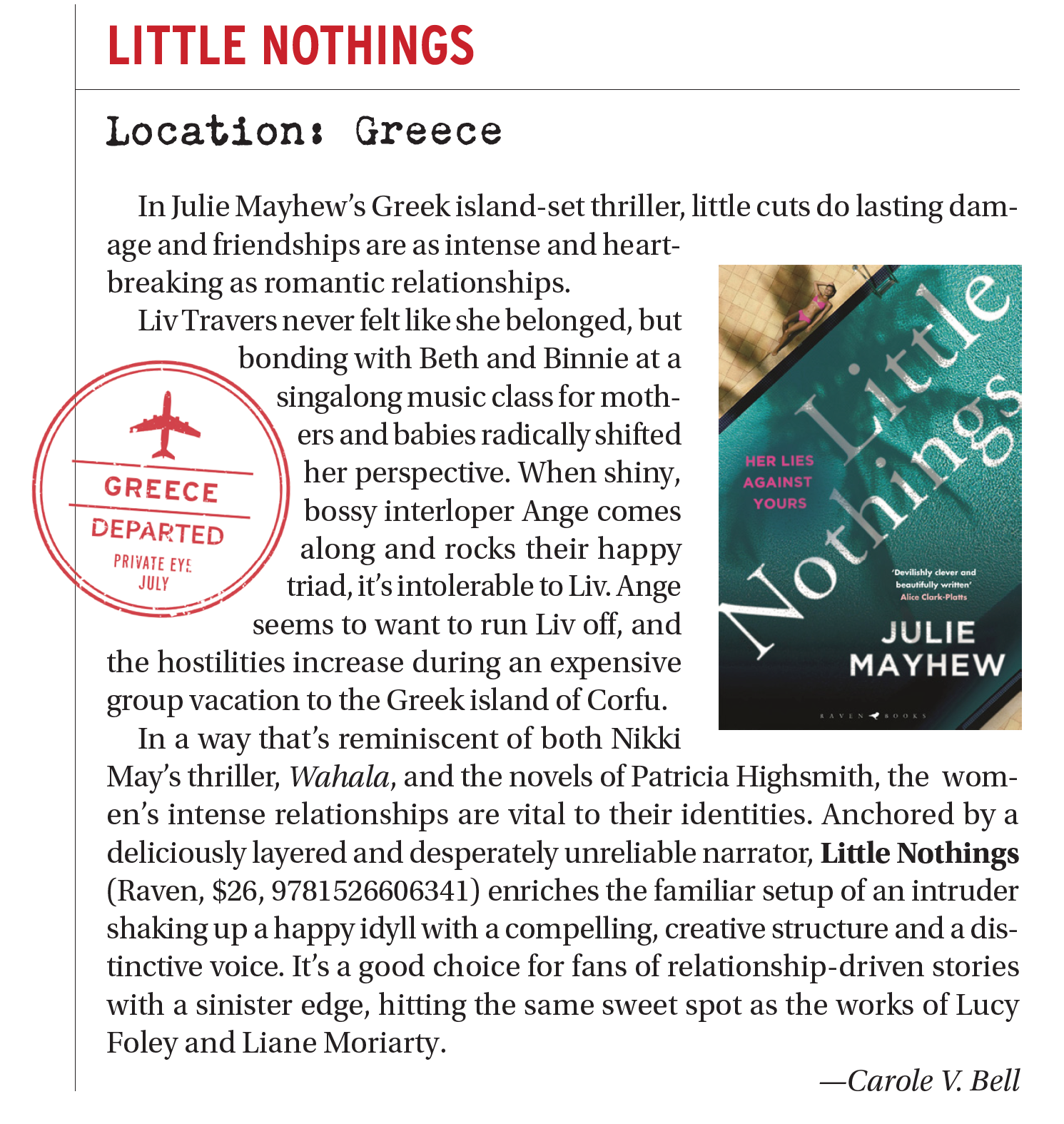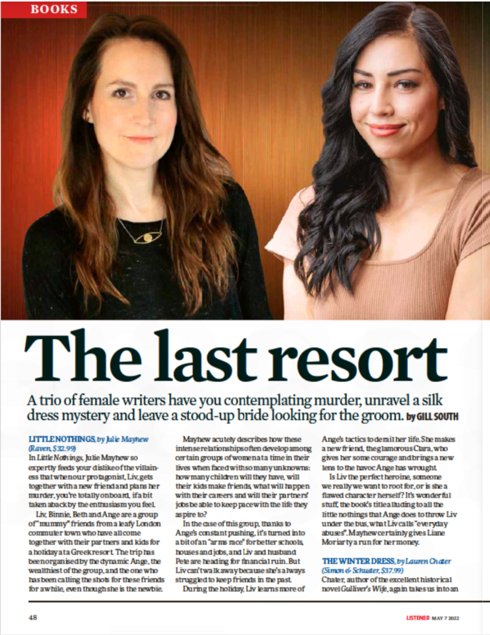 “In Little Nothings, Julie Mayhew so expertly feeds your dislike of the villainess that when our protagonist, Liv, gets together with a new friend and plans her murder, you’re totally on board, if a bit taken aback by the enthusiasm you feel… Is Liv the perfect heroine, someone we really want to root for, or is she a flawed character herself? It’s wonderful stuff, the book’s title alluding to all the little nothings that Ange does to throw Liv under the bus, what Liv calls “everyday abuses”. Mayhew certainly gives Liane Moriarty a run for her money” - The Listener, NZ