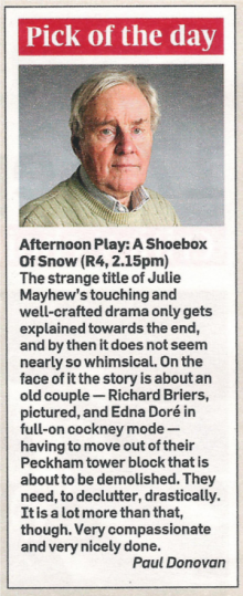NOMINATED Best Original Audio Drama, BBC Audio Drama Awards 2013 | SHORTLISTED Nick Darke Award 2010 (as a work in progress) | PRODUCED BY Justine Potter for Red Production Company / Savvy Productions, for BBC Radio 4 | FIRST BROADCAST 16 Sep 2011 | CAST Joe Armstrong, Edna Doré, Richard Briers, Julie Mayhew